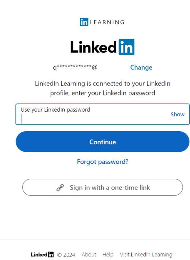 If you have chosen to connect your LinkedIn account, or if you have already done so previously, you will be requested to enter your personal LinkedIn password to login to LinkedIn Learning. Enter your LinkedIn password to continue.